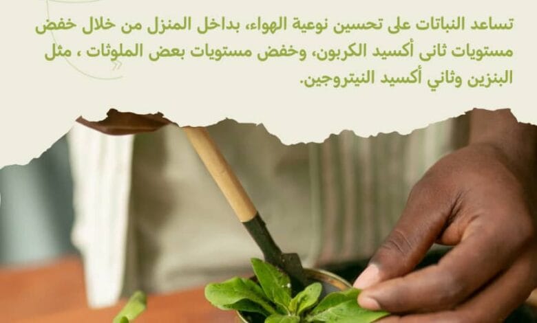 تساعد النباتات على تحسين نوعية الهواء، بداخل المنزل من خلال خفض مستويات ثانى أكسيد الكربون، وخفض مستويات بعض الملوثات ، مثل البنزين وثاني أكسيد النيتروجين.